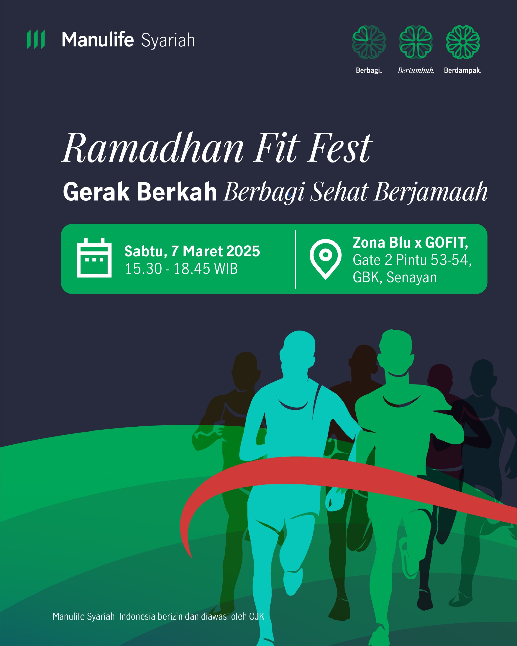 Yuk gabung di Ramadhan Fit Fest bareng Manulife Syariah Indonesia, ikuti rangkaian aktifitas yang menyehatkan & seru untuk mengisi waktu ngabuburit kamu dengan kegiatan positif & berkah, karena selain berolahraga kamu juga akan terlibat dalam gerak berkah berbagi takjil di GBK 🫶🏻